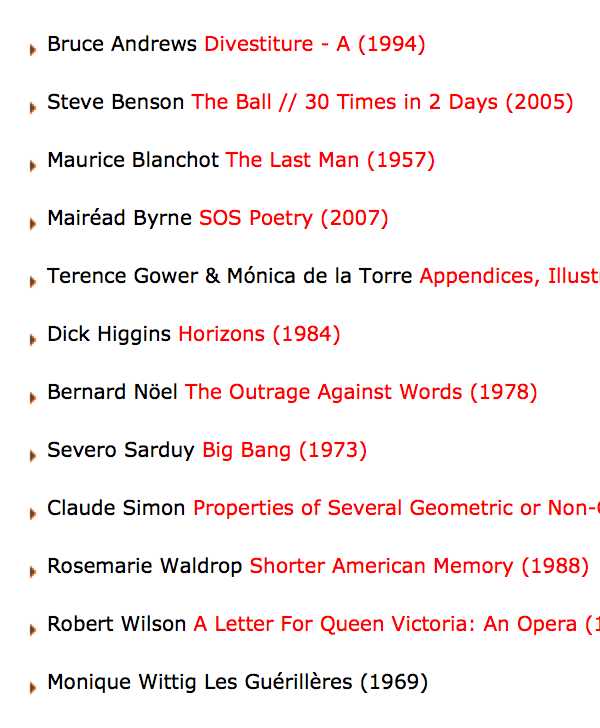 | UbuWeb is pleased to present the latest installment of our ongoing series of full-length e-books. Titles for this series include works by Steve Benson, Maurice Blanchot, Mairéad Byrne, Terence Gower & Mónica de la Torre, Dick Higgins, Bernard Nöel, Severo Sarduy, Claude Simon, Rosemarie Waldrop, Robert Wilson, and Monique Wittig. This new series of /ubu editions presents eleven out-of-print works from 1957 to 1994 — and also includes three newer titles (1999-2007). Of the historical republications, there are three works of poetry, three works of prose, one opera libretto, one work of critical theory, and one manifesto – though each piece blurs these genres. Seven were written in English, four appear in translation, and one is bilingual. Two authors could be considered language poets, two are associated with Tel Quel, one arguably initiated Fluxus, another arguably initiated the new novel. Four are women, nine are men. One title was changed for its /ubu publication. | ![]() Editor of /ubu Editions, Third Series |